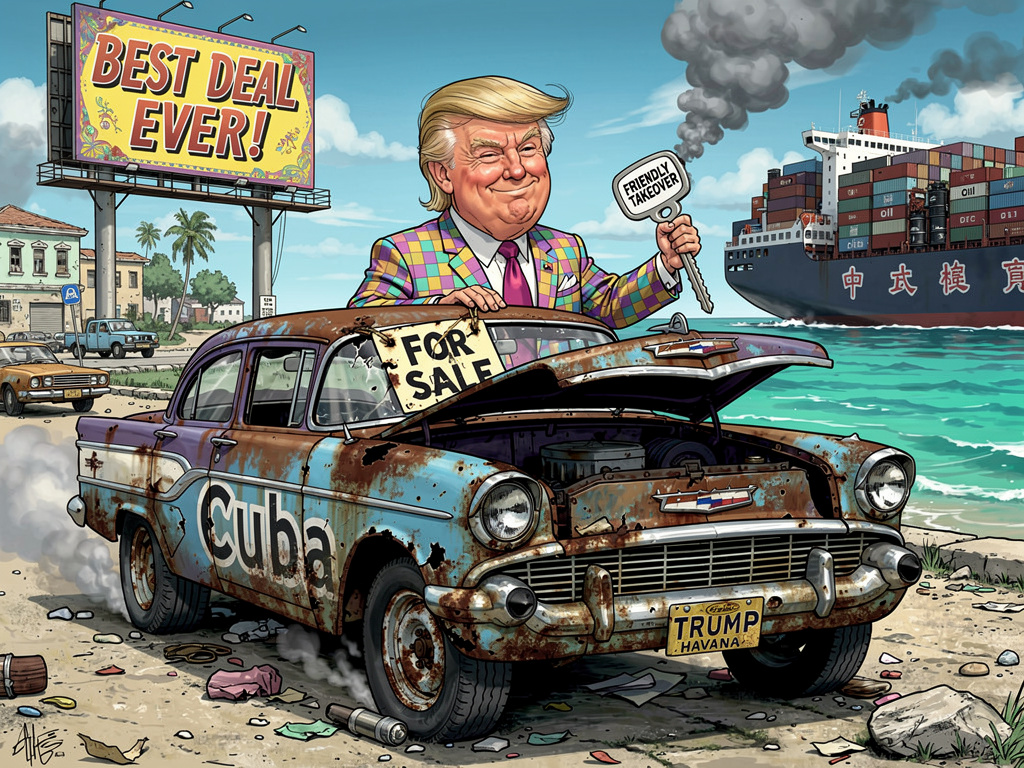 El presidente Trump —sí, ese otra vez— acaba de lanzar su versión de “ayuda humanitaria”: una “toma amistosa” de Cuba, ahora que la isla está más quebrada que un iPhone después de un viaje en almendrón. No es una invasión, claro. Es una “inversión estratégica”. Como cuando un fondo buitre compra un edificio en ruinas para convertirlo en lofts de lujo… sin preguntarle a los inquilinos.